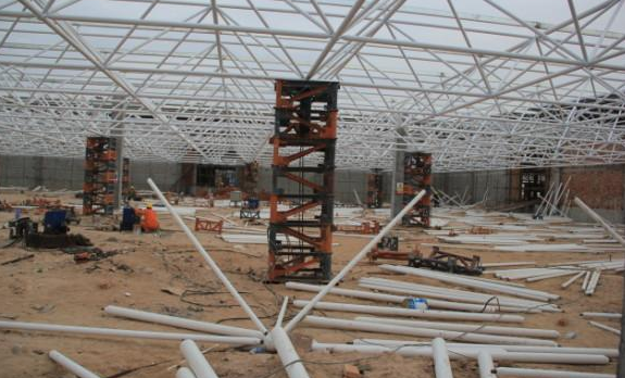 5)总体晋职法:此步履多使用在周边支护以及有多点支护的网架结构,可采取平板升降机、液压千斤顶等小型机具作业吉安施工;